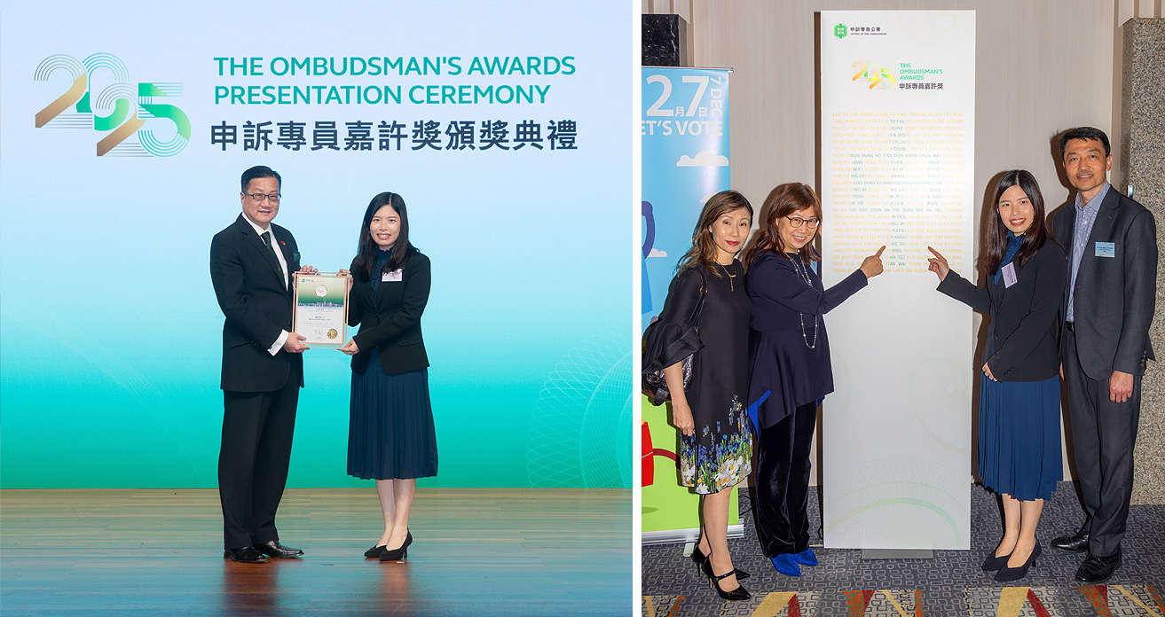 At The Ombudsman’s Awards Presentation Ceremony held on 18 November 2025, Miss YEUNG Shu-man, Emily, Insolvency Officer I, was commended and granted an individual award under the Ombudsman’s Awards for Officers of Public Organisations in recognition of her exemplary performance and strong sense of responsibility in handling complaints/enquiries/requests for information and addressing them in a prompt and thorough manner. Her dedication and professionalism in handling these matters is instrumental in enhancing image of the department and boosting public confidence in the administration of insolvency cases.